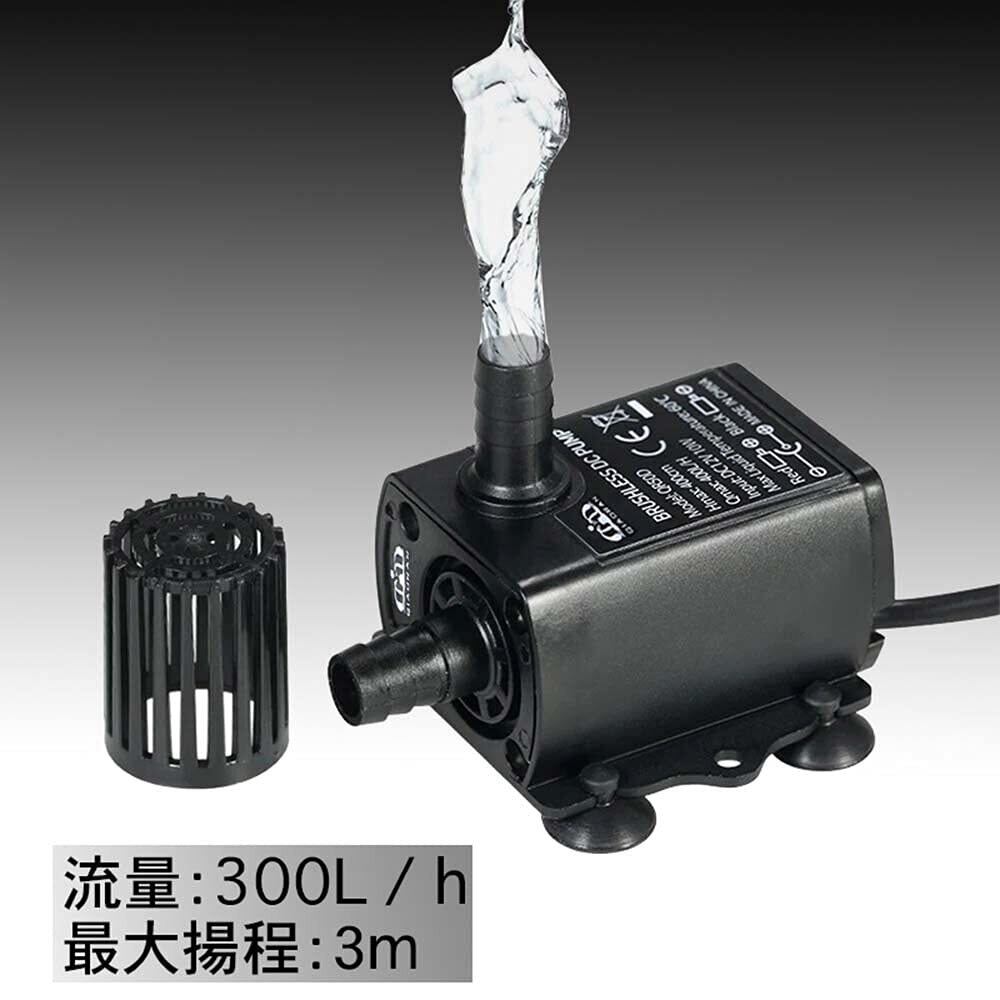 【製品仕様】稼働電圧:DC12V、最大流量:240L/H、最大揚程:3メートル、定格電流:300mA、定格消費電力:4W、定格電圧:DC12V、ケーブル長さ:1.5メートル。 ・水中、もしくは水槽などの容器の外側でも使用することができます。 水中で使用する場合は、本体ごと水中に沈めてください。 外側で使用する場合は、水面よりも低い位置から水を取り込むようにしてください。 ・DCプラグ専用です。直接家のコンセントに接続することはできませんので、写真にてコード先端の形状をご確認ください。 ・ソーラーパネルや水槽用電気器具の電源から直接繋ぐこともできますが、接続端子がDCプラグであることを確認してからご購入ください。 ・水の勢いが悪くなった時や水が出なくなった場合は、目詰まりしている可能性があります。