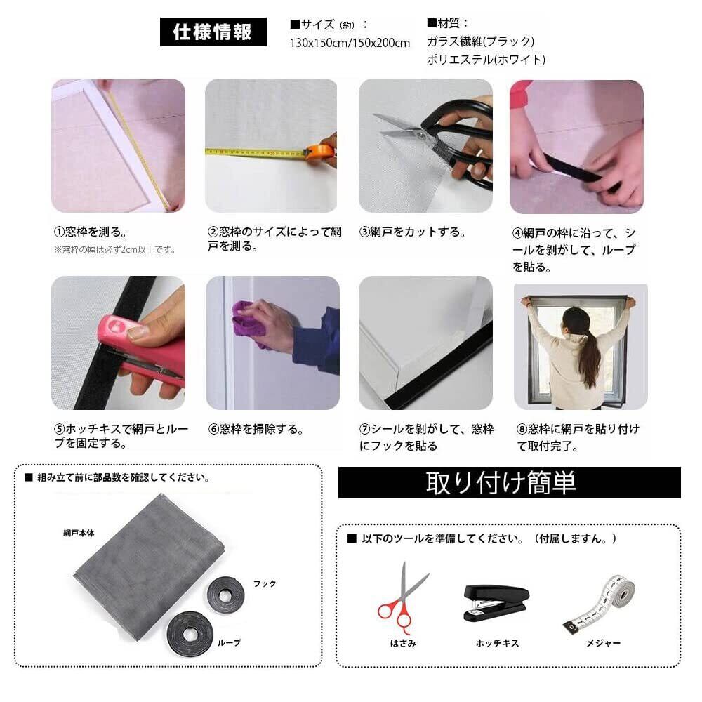 網戸キット 簡易網戸 張り替え 網戸用ネット 虫よけネット 防虫網 換気 自由にカット可能 DIY 幅広い 取り付け簡単 暑さ対策 1.3m*1.5m ホワイト 日本語の説明書付き