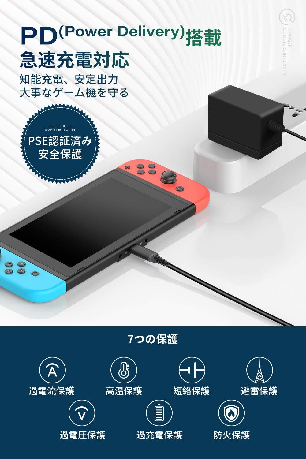 ●【PD搭載、急速充電】USB PD(Power Delivery)規格を搭載しますので、充電スピード大幅にUP!電池切れの場合、2~3時間でフル充電できます。充電時間短縮し、ゲームをもっと楽しめられます。もちろん、充電中ゲームでき、大切な時間を無駄にしません!出力:5.0V-1.5A / 15V-2.6A、入力:AC100V~AC240V、世界各国の電圧に適用、海外旅行や出張の時も充電問題の心配ありません。