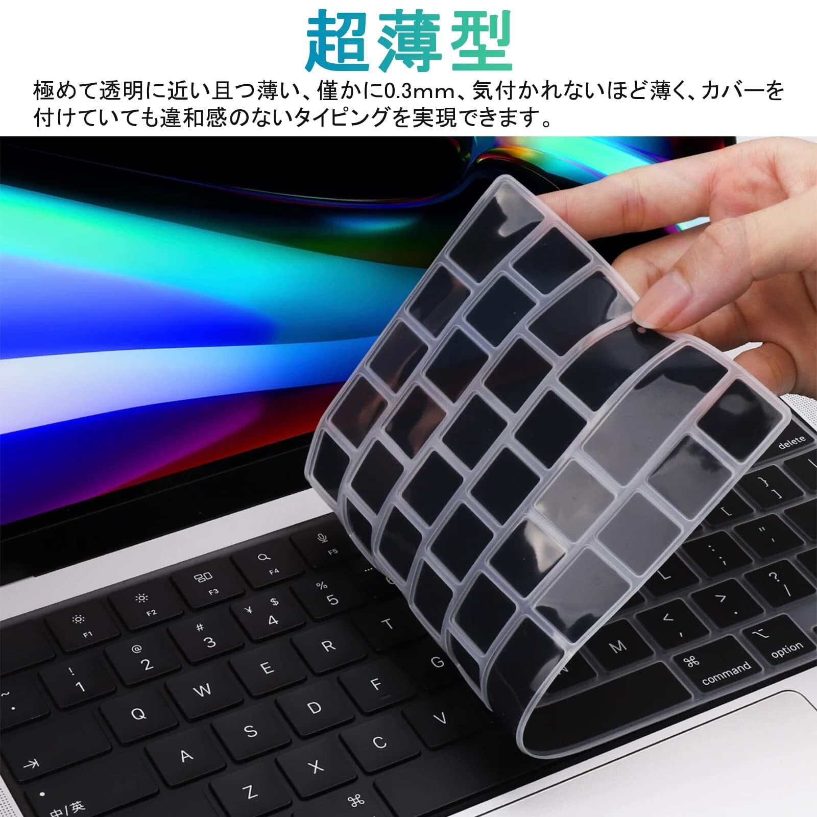 【超薄型】極めて透明に近い且つ薄い、僅かに0.3mm、気付かれないほど薄く、カバーを付けていても違和感のないタイピングを実現できます。