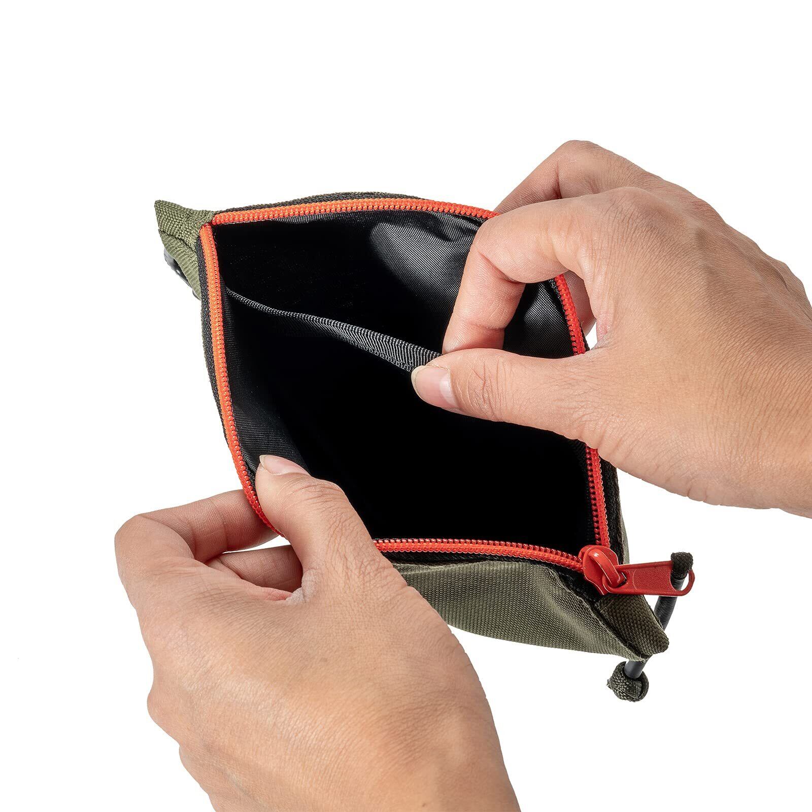 頑丈なカラビナで、アウトドア時カバンに掛けたり、枝、ランタンスタンドなどに掛けてもケースの開け閉めに影響しません。家で使ったら壁付フックに掛けても問題ありません。