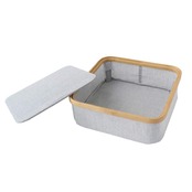 【サイズ】約W28.5×D28.5cm×H10cm 【素材】竹、布(ポリエステル、コットン) 【耐荷重】バスケット:約1.5kg、ふた:約3kg 【生産国】中国