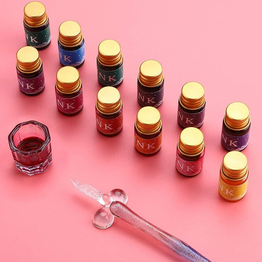 Mancola ペン2*本体 インクガラスディップペンインクセットレインボークリスタルガラスペン、アート、ライティング、署名、書道、装飾用の12種類のインクMA-JP-16