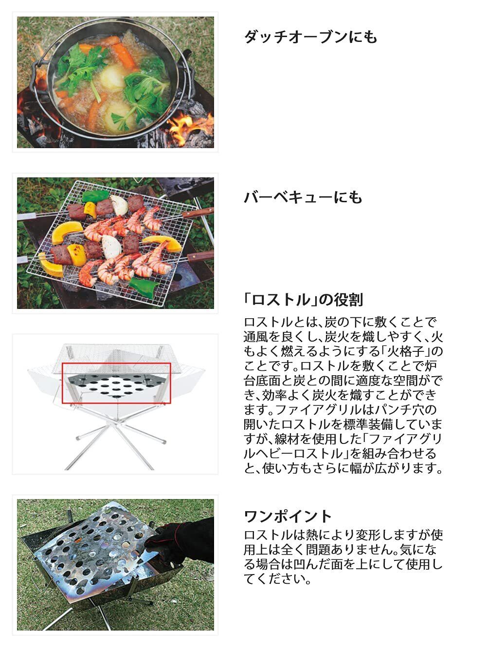ファイアグリルがあれば、フィールドを傷めることなく焚き火・ダッチオーブン・BBQなど、アウトドアでやってみたいことが手軽に楽しめます。 リーズナブルながら、ハードな使用にも耐える高い強度と炉の熱変形を防ぐ確かな技術が詰まっています。