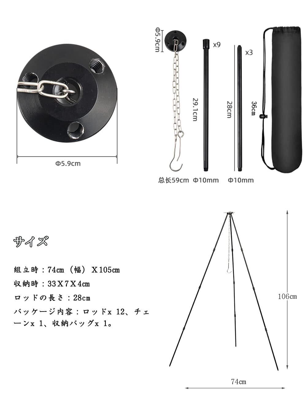 【15kg耐重】軽さと強さを併せ持つアルミ合金製ポールを採用しており、焚き火三脚のフックは最大15kgまで耐えられる設計です。ご注意:製品表面に多少の傷、汚れある場合があります。 ご了承の上お買い求めいただきますようお願いいたします。