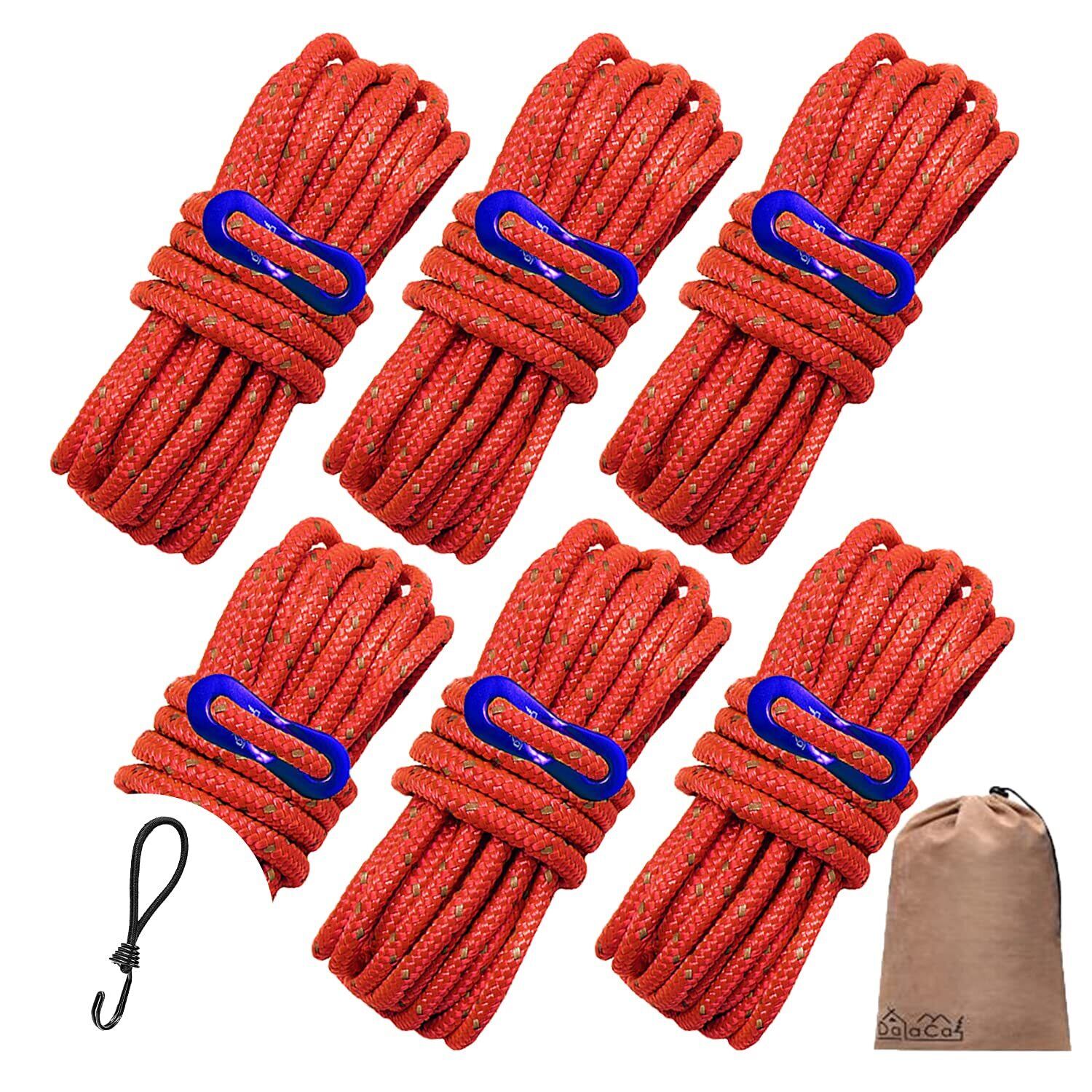 DaLaCa パラコード テントロープ タープロープ ガイロープ 反射材入り 太さ 4mm 長さ 4m 6本 / 8本 / 10本 セット 耐荷重 300kg 自在金具 収納袋 ストレッチコード 付き (レッド6本+ストレッチコード6本)