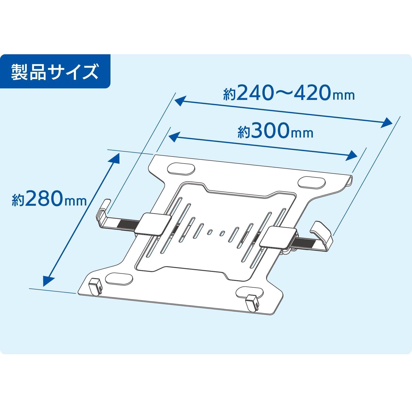 【 仕 様 】■ 適用サイズ:10~15.6インチノートPC■ 最大荷重:4.5kg■ 材質:スチール・プラスチック■ 製品サイズ:(約)幅300×高さ280×奥行64mm ※両サイドの固定用アーム幅が約240~420mmまで調節可能■ 質量:約1.19kg■ 内容物:本体×1、固定用アーム×2、アーム固定パーツ×2、固定ネジ×4、ワッシャー×4≪ご注意≫※ ネジ類がゆるんだまま使用しないでください。定期的にネジの締め直しを行ってください