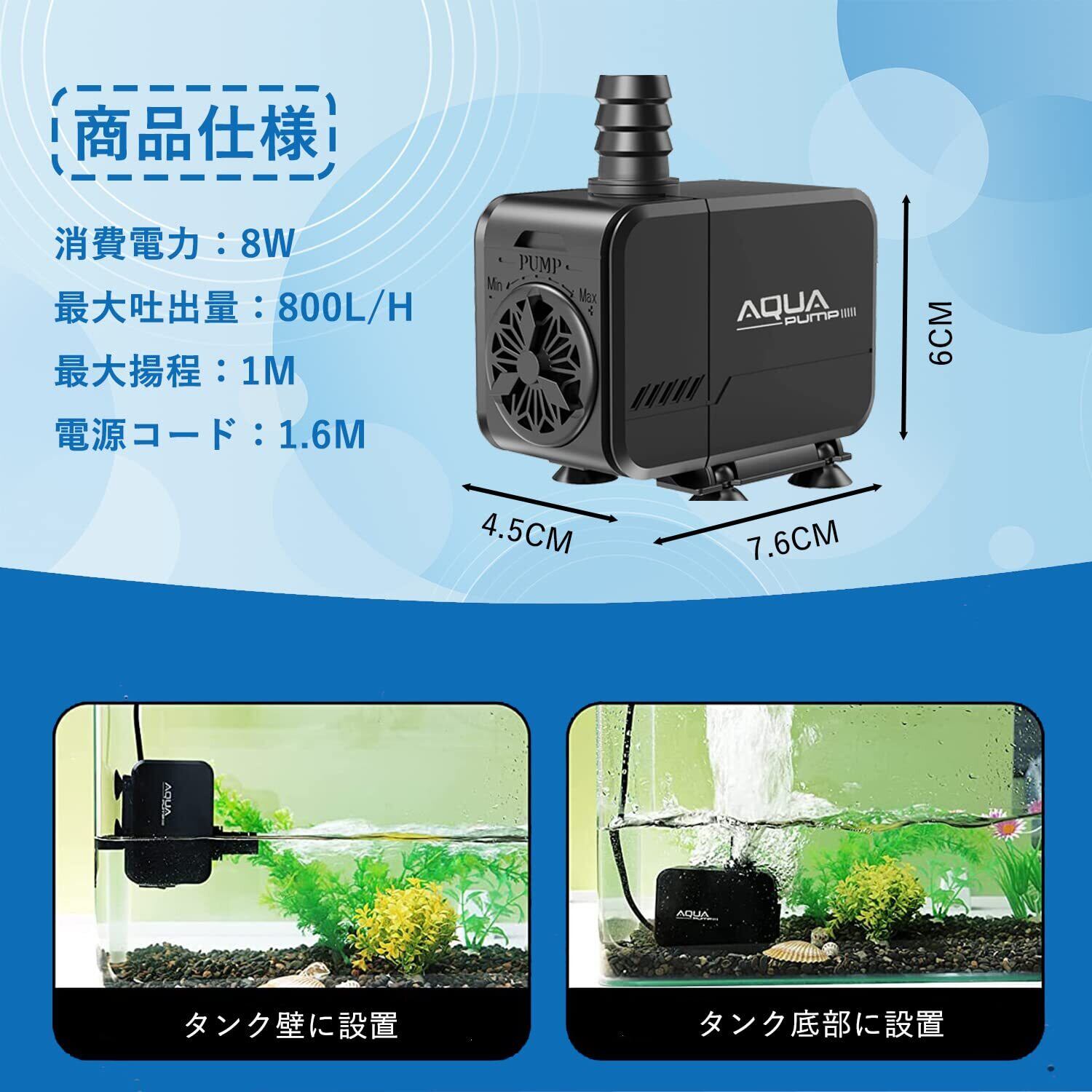 THYESCOM 水中ポンプ 小型ポンプ 吐出量800L/H 揚程1M 給水ポンプ 静音設計 排水ポンプ 100V 水槽水循環ポンプ 吐出量調整可能 ミニポンプ ウォーターポンプ 水耕栽培・水族館水換え・養殖場適用 8W