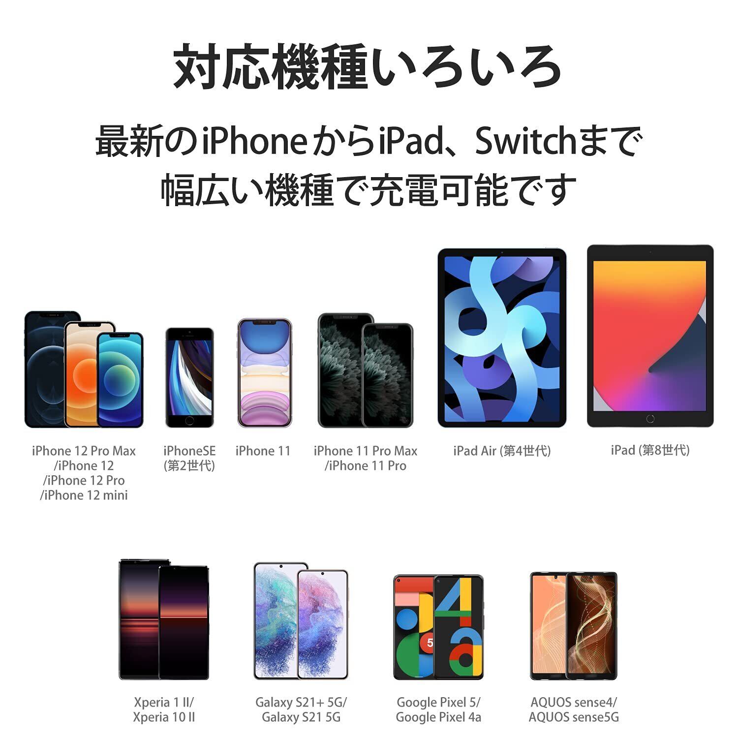 端末に応じて出力が5V/3A、9V/2.22Aと可変し、iPhoneなどのスマートフォンから、NINTENDO SWITCH(TM) などのゲーム機まで幅広く高速充電できます。※ NINTENDO SWITCH(TM) はドックでの充電はできません。