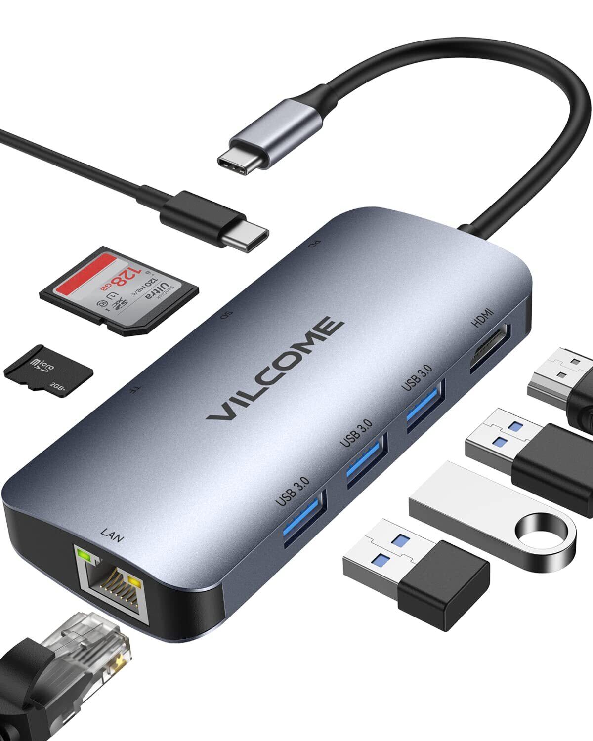 USB C ハブ Vilcome 8in1 Type C ハブ マルチポート 変換 アダプター ドッキングステーション【100W PD電源供給 / LAN 1Gbpsイーサネット / 4K HDMIポート/SD / Micro SD/TF カードリーダー スロット搭載 / USB 3.0 *3 高速データ転送 】MacBook Pro/ Mac Book Air/ iPad Pro 2018 2020/ Dell XPS 15 13 / Surface Go / Huawei Matebook 等タイプC機種対応テレワーク リモート 在宅勤務 ウェブ会議対応