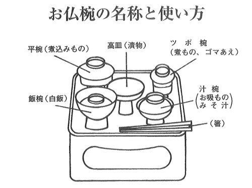 セット内容 ・仏膳 ・お箸、飯椀(御飯) ・高皿(漬物) ・ツボ椀(煮物・ゴマ和え) ・手腕(煮込みもの)