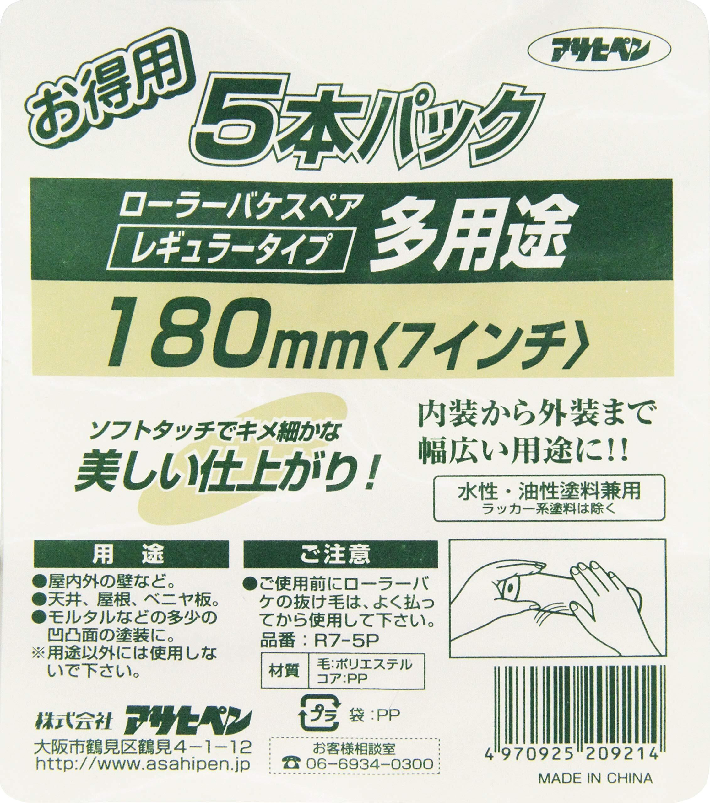 【商品名】 アサヒペン 多用途ローラーレギュラー5本パック 180MM R7-5P 【サイズ】 商品荷物数:1 【商品説明】 品番:R7-5P 規格:180MM