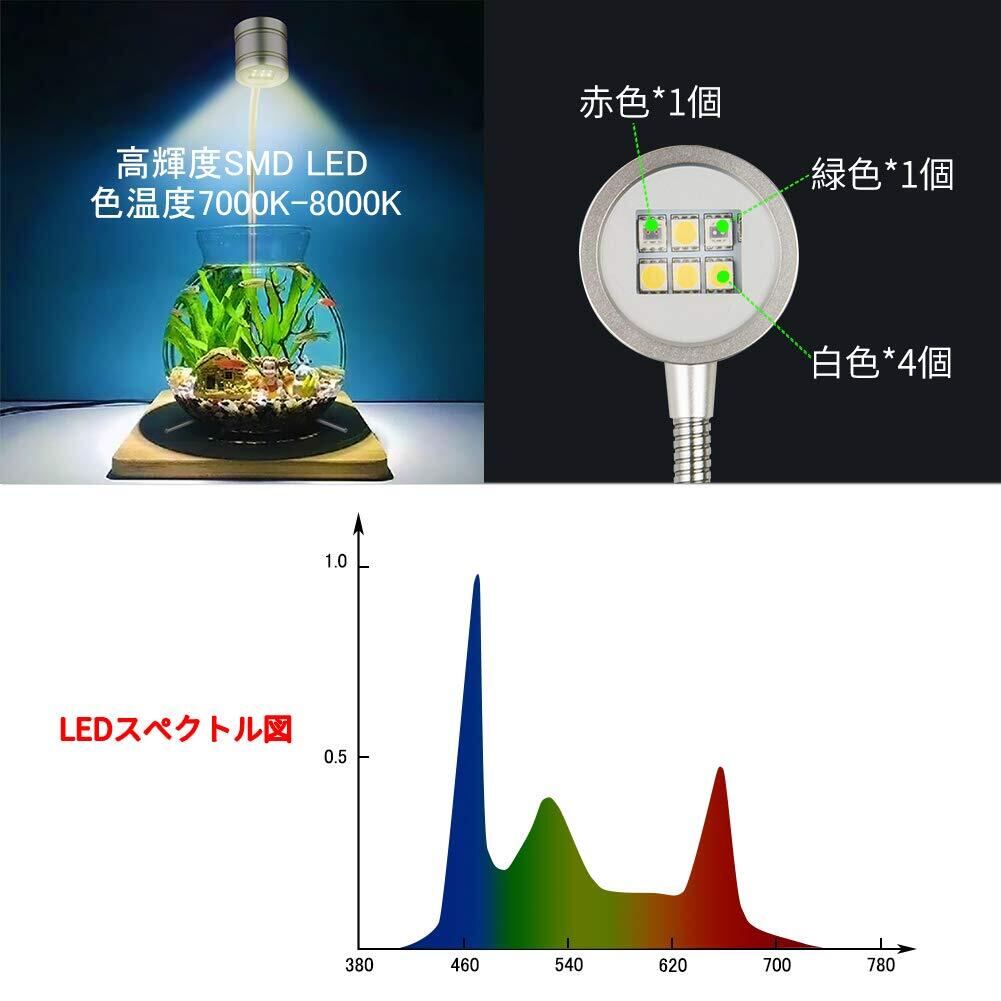 水草・植物の成長と、植物を色鮮やかに見せる自然な白色の明るさ・色温度を兼ね備えた、小型水槽にぴったりの水草植物育成ライト。テラリウム、水草、観賞魚、ボトリウム、苔玉、多肉植物に適用します。