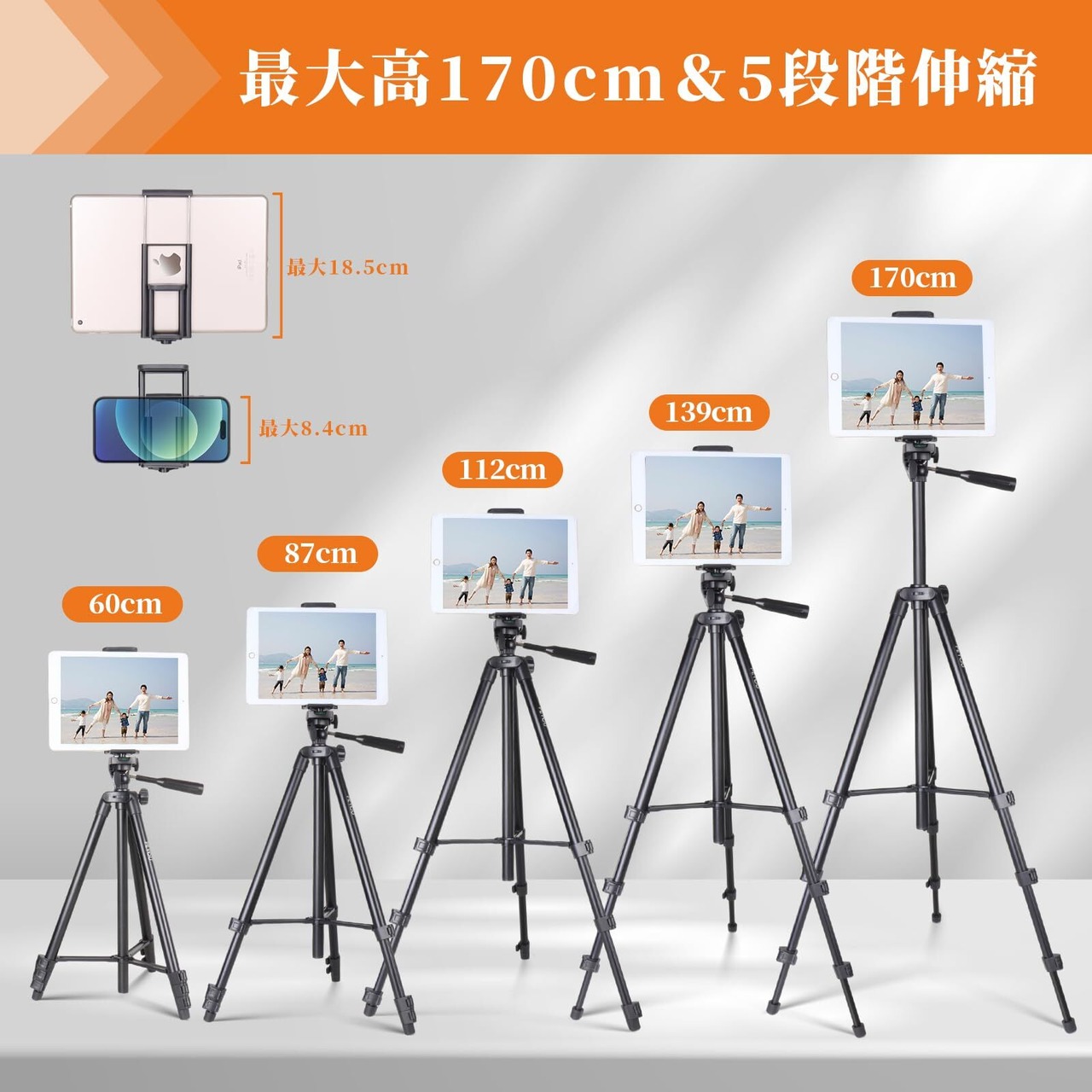 【5段階伸縮・41cm-152.4cm調節自由】三脚は5段階で伸縮可能、クイックリリースレバーロック付きの4セクションコラム伸縮ポールにより、最短41cmから最長170cmまでお好みの高さに調節し使用できます。タブレットを取り付けた状態では170cmの高さに達することができます。全身を撮影できるだけでなく、より広い範囲を撮影することができます。特别にアウトドアで人物と風景が一体になった写真をより美しく撮影することができます。