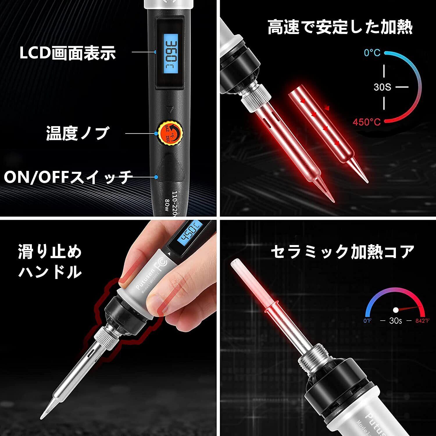 Putusen はんだごて セット 80W 温度調節可 LEDデジタル(200℃-450℃)オン/オフスイッチ付き 精密半田ごて 5 つチップ付き 基盤電子作業/電気DIY用 日常家庭用