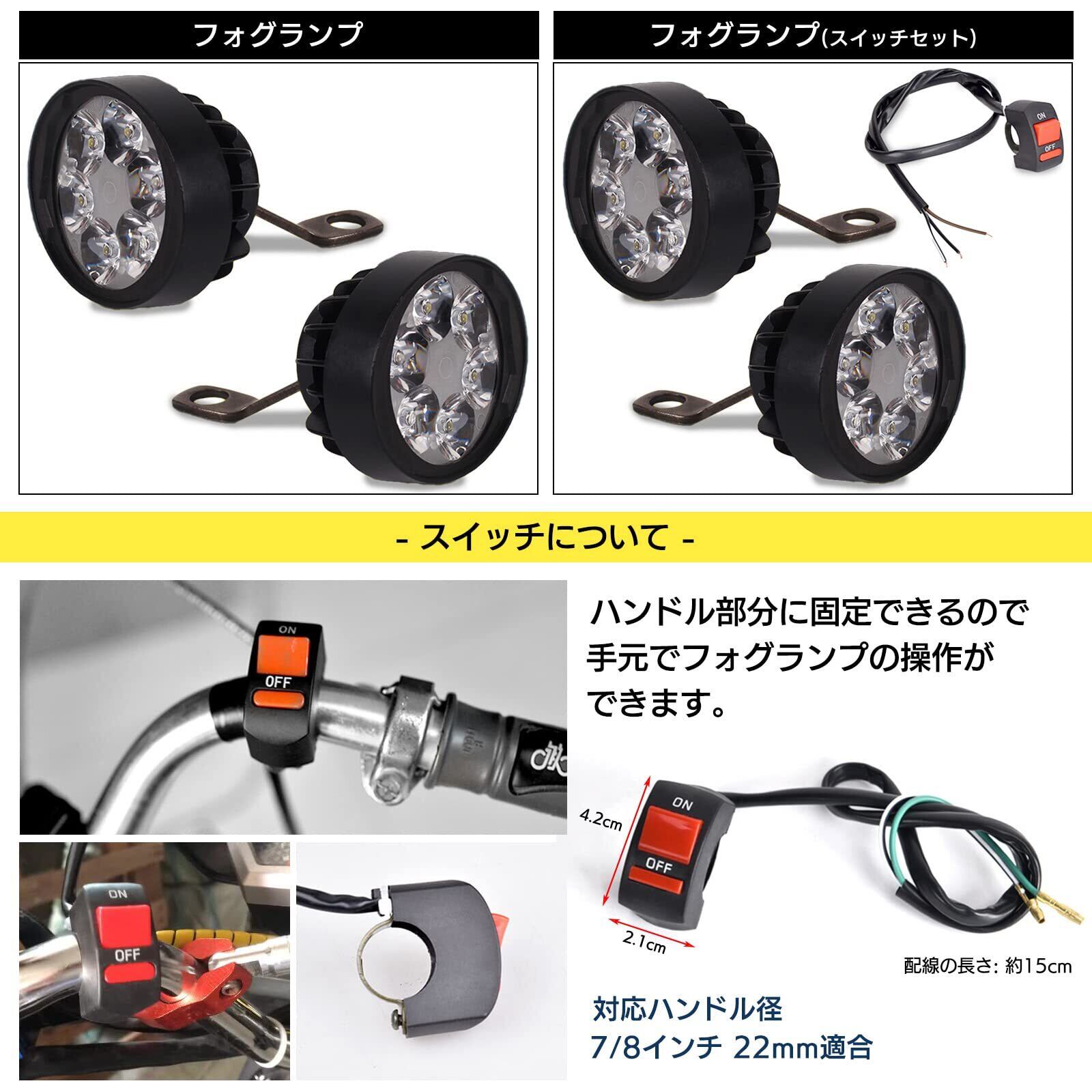 汎用でバイク用の6LEDフォグランプで2個セットです。 ハンドルスイッチ付属も販売しているのでお好きな方をお選びください。 ※ステーはボールジョイントなので工具無しで向きや角度調整をできます。 (調整しきれない場合はステーを曲げて調整して下さい)