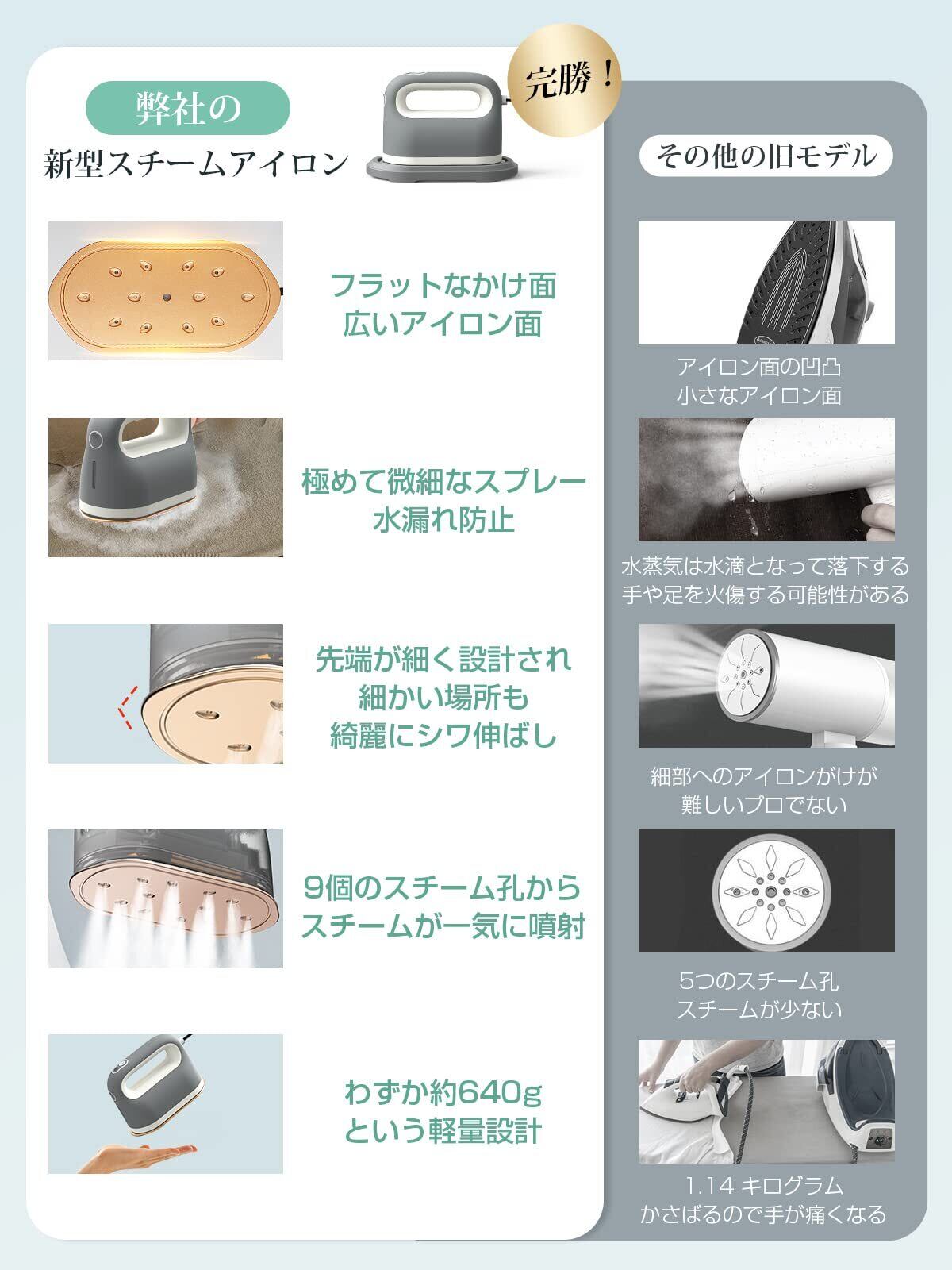 【超強力·長持続力スチーム&20秒素早く立ち上がり】衣類スチーマーの噴射する蒸気は22g/分としっかりシワを落とすスチーム量、9孔のスチームが広範囲に多く展開されることに加え、噴出できるスチームの範囲が広がり、シワ伸ばしの時間を短縮できるし、衣類全体をムラなくキレイにシワ伸ばしできながら、ハイパワースチームで除菌*消臭、衣類についた花粉やアレル物質の軽減にも役立ちます。 「軽量」本体が640gだけ、手元の負担を軽減する手元重心設計のため、片手で持っても楽にアイロンかけます。専用スタンドが付き、置き場所に困りません。