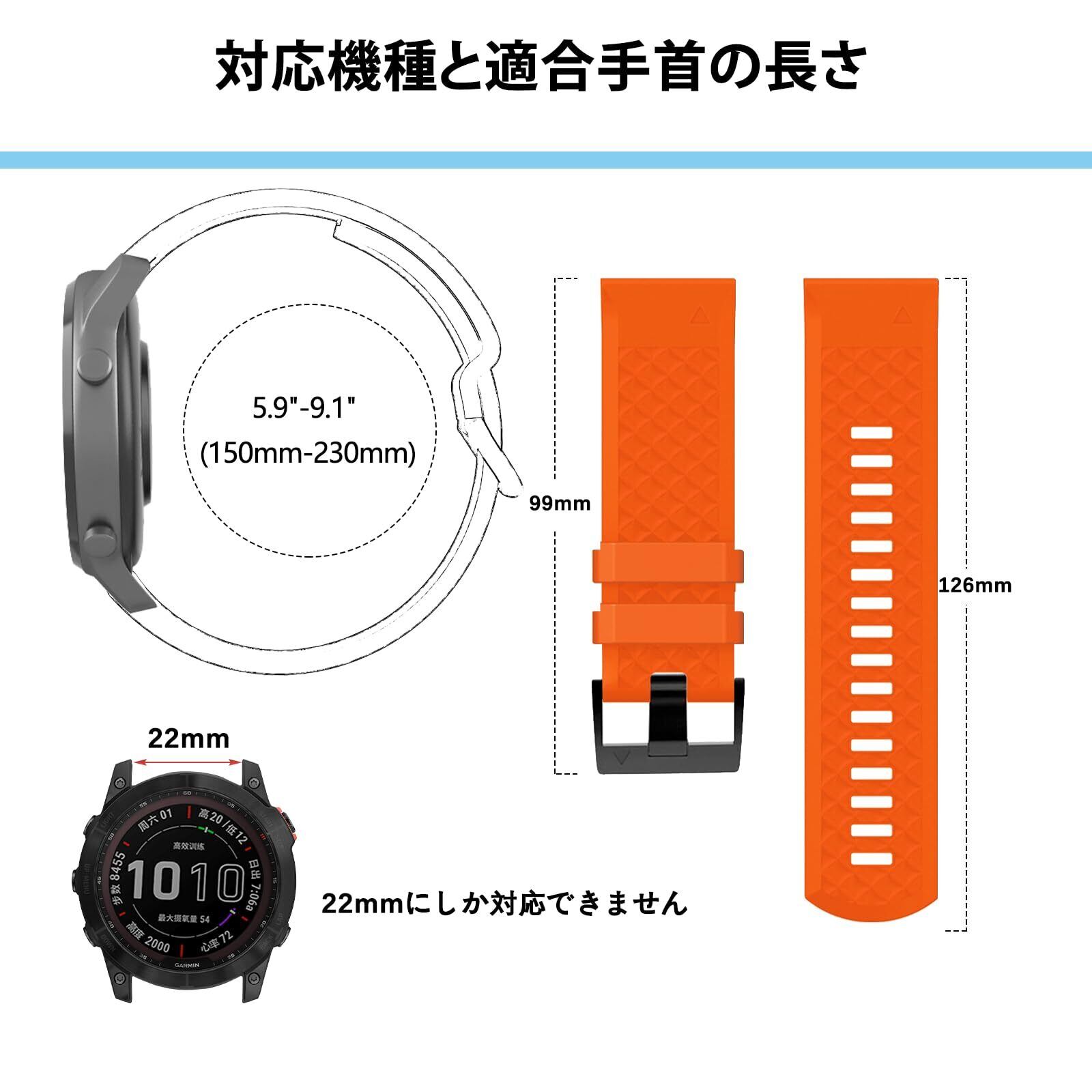【適用機種】:Garmin Fenix 7 Pro/MARQ GOLFER (Gen 2)/Epix (Gen 2)/Descent G1 Solar/epix/Fenix 7/Approach (S62/S60)/Fenix 6/Fenix 6 Pro/Fenix 6 Pro GPS/Fenix 6 GPS/Fenix 6 Sapphire/Fenix 6 Sapphire Solar/Fenix (5/5 Sapphire/ 5 Plus)/Quatix(5/ Sapphire)/Quatix (7 Sapphire Edition/7 Standard Edition)/MARQ (Athlete/Aviator/ Captain/ Driver/ Expeditio)/quatix( 6/ 6 Titanium)/quatix (5/ 5 Sapphire)互換性があります、スマートウオッチは別売です。22mmにしか対応できません。ストラップの最小長さ(11cm /4.33インチ)+ダイヤルの長さ~最大長さ (19 cm/7.48 インチ) + ダイヤルの長さです。