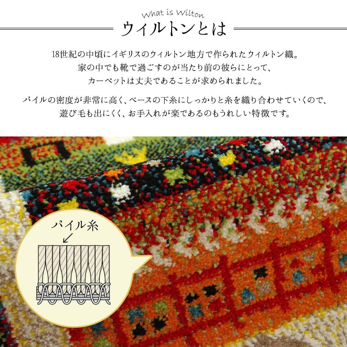 ウィルトン織りの玄関マットです。ウィルトン織りは非常に耐久性の高い織物です。家の中でも靴を履いて生活するヨーロッパで,土足で扱うことを前提として作られておりますので,長時間踏みつけてもヘタリにくく,弾力性もあり長くご使用頂けます。本商品の『繊維の密度を表すノット数』は112,000ノットです。本商品のパイル部分にはポリプロピレン素材を使用しております。ポリプロピレンはヘタリにくく,耐久性に優れ,繊維の中でも軽い素材です。また,汚れが付着しにくく,遊び毛や毛玉が非常に出にくいという特徴もあります。玄関のワンポイントとして,ご使用していただきますと華やかになり高級感がでます。抗菌・防臭,消臭機能がついていますので,臭いが気になる玄関でも安心してお使いいただけると思います。