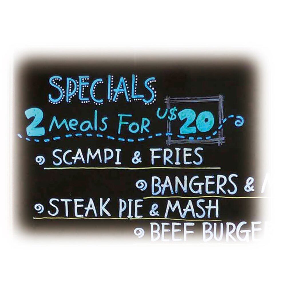 ブラックボードのメニュー書きに最適なボード用マーカー。乾いたタオルで消すことができます。1.2mm芯の5色セットです。筆記後、チョーク風の色合いが徐々に浮き上がってきます。
