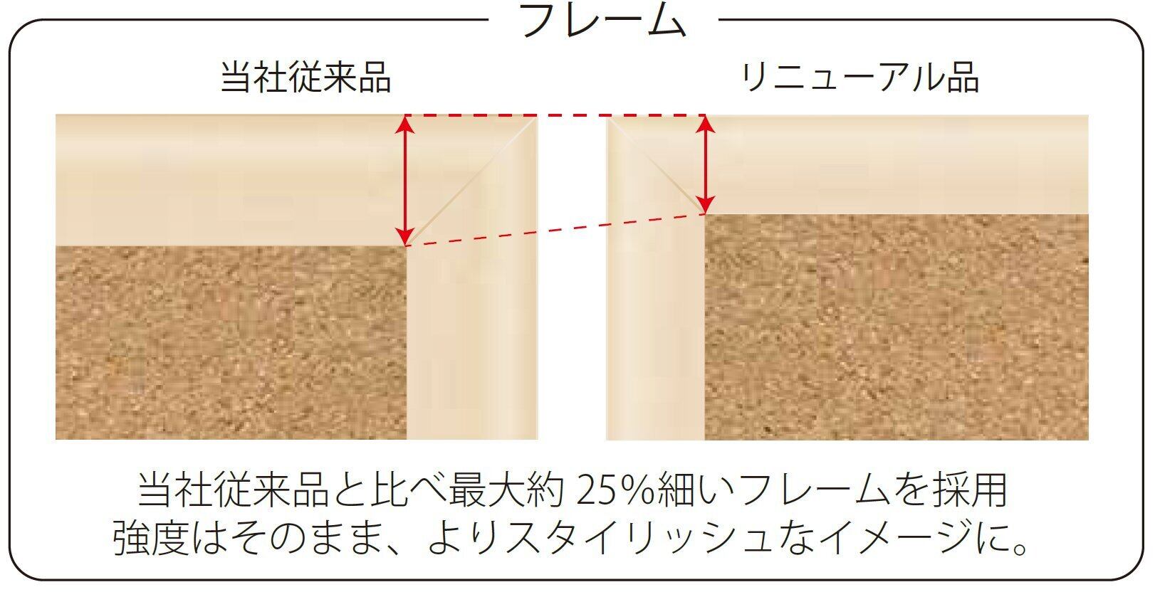 ●当社従来品と比べ最大約25%細いフレームを採用。強度はそのまま、よりスタイリッシュなイメージに。