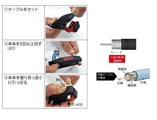 ・使用上のご注意:・標準刃は外被切断幅6mm〔替刃(別売)で外被切断幅4mmに対応〕 ・傷んだ刃は交換が可能(別売) ・同軸ケーブルの太さ、品種、メーカーにより、外被と絶縁体の硬さ(切断性)が異なります。皮むき時の本体を回す回数がケーブルにより異なりますので充分にご注意ください。