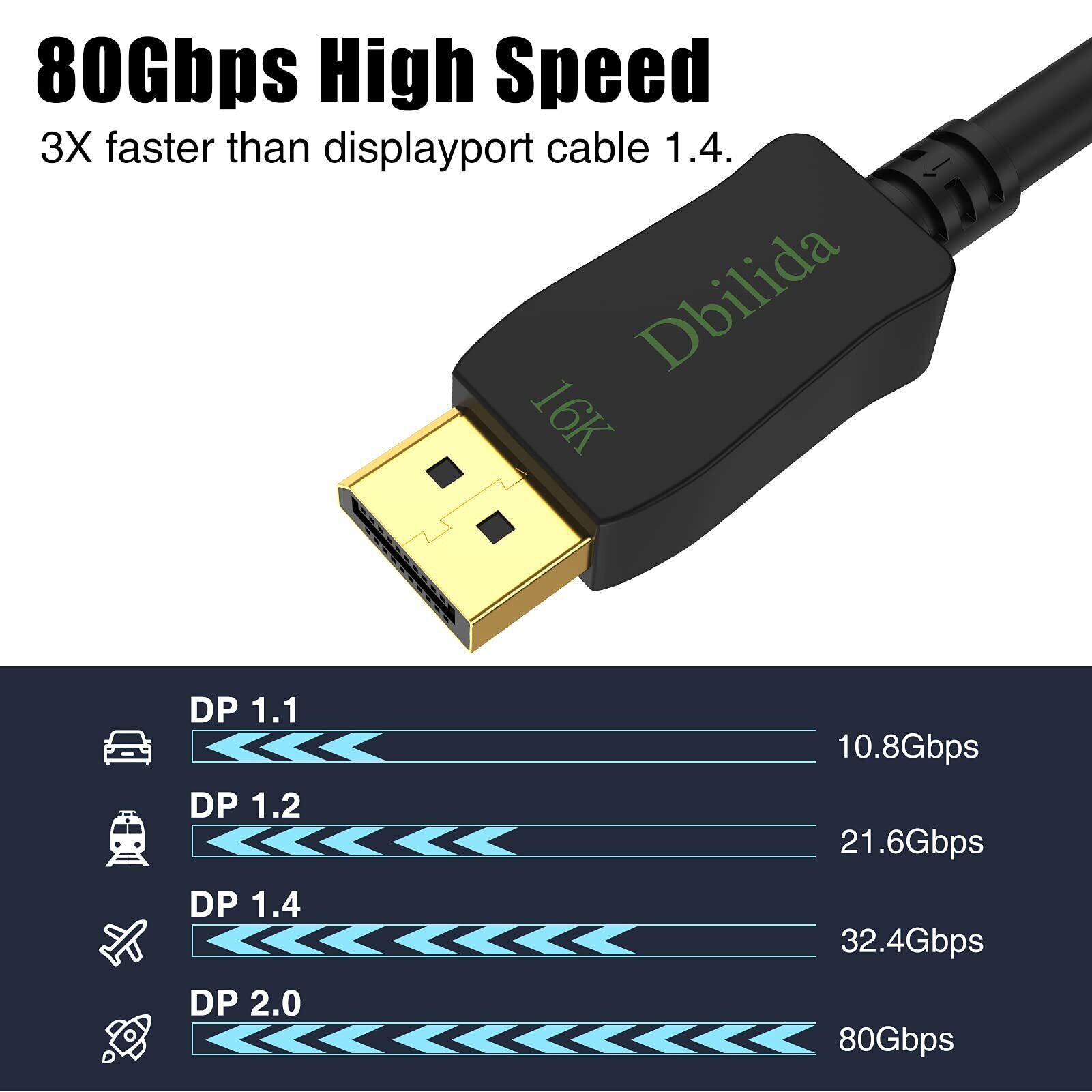 ⚡【16K@60Hz & 8K@120Hz】Dbilida displayport 2.0 ケーブル サポート 16K@60Hz with DSC, 10K@60Hz, 8K@120Hz/60Hz, 4K@240Hz/165Hz/144Hz/120Hz。 シングル画面のビデオ出力16K@60Hz( DSC)、10K@60Hz、4k@240Hz。デュアルスクリーン8k@120Hz/4K@144Hz。3画面10K@60Hz。圧縮されていないデジタル7.1、5.1または2チャンネルのための完璧なオーディオパススルー。