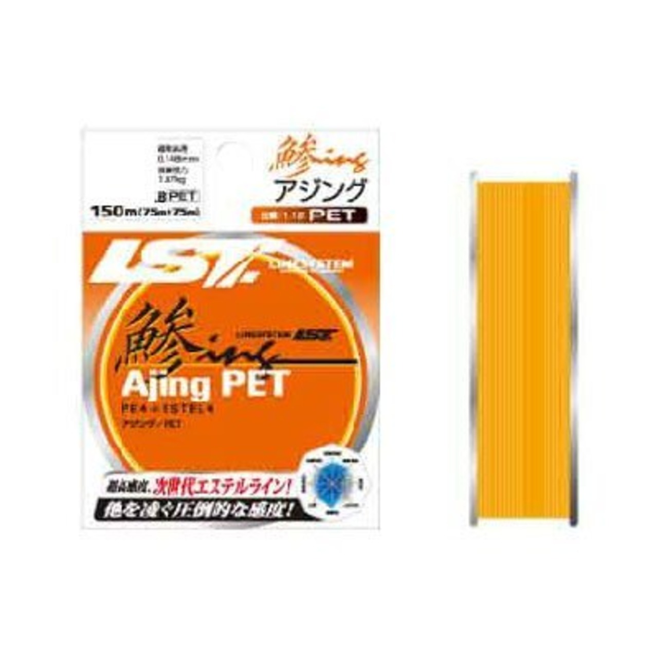 PET(ポリエステル)の特徴は1.41。ナイロン(比重:1.14)に比べ約20%強の重さがある。次に吸収率、ナイロンは約20%吸水をするがPETはほぼゼロ。この違いがアジングの釣り方に新たな世界を提案する。塩分によるベトツキをなくし、軽いジグのフォーリングのスピードも速い。また糸フケも大幅に軽減するので感度も抜群。