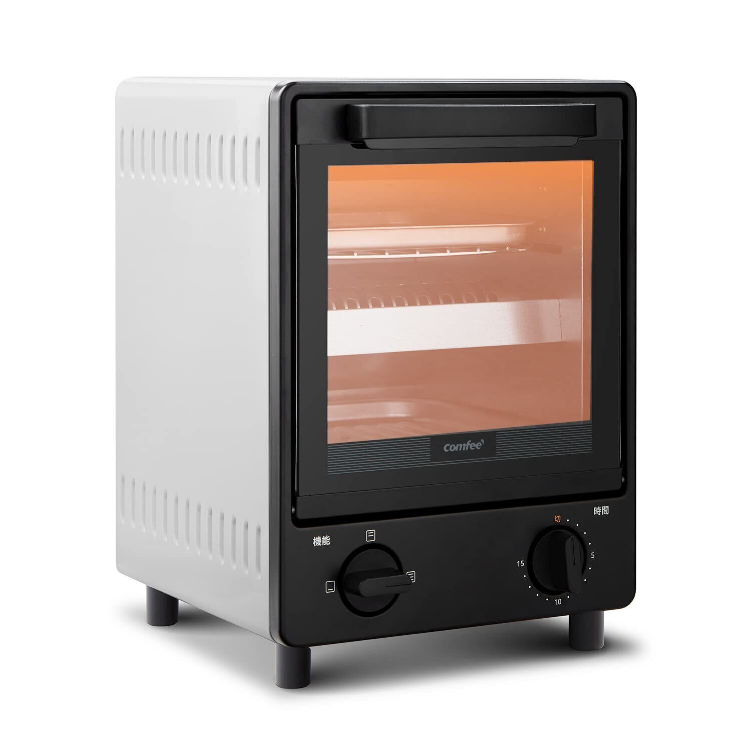 【商品仕様】COMFEE' 縦型オーブントースター:◇コンパクトなサイズ:幅25.8x奥行き23.2x高さ33.3㎝、約3kg ◇容量:8L、トースト2枚焼き ◇電源:AC100V ◇最大出力:1,000W ◇タイマー:最大15分 ◇機能:ピザ・トースト・切り餅・グラタン・バターロールなどの焼き料理◇加熱モード:上下中ヒーター・下ヒーター・上中ヒーター◇電源コード長さ:1m◇付属品:パンくずトレイ*1・受け皿*2・日本語取扱説明書※ 製品期間:一年間