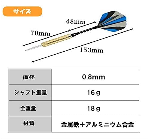 【パッケージ内容】ダーツ×12、フライト×36、 滑り止めOリング×50、専用収納袋×1 【材質】金属鉄+アルミ合金 【全長】153mm 【シャフトの長さ】48mm 【シャフト重量】16g 【全重量】18g