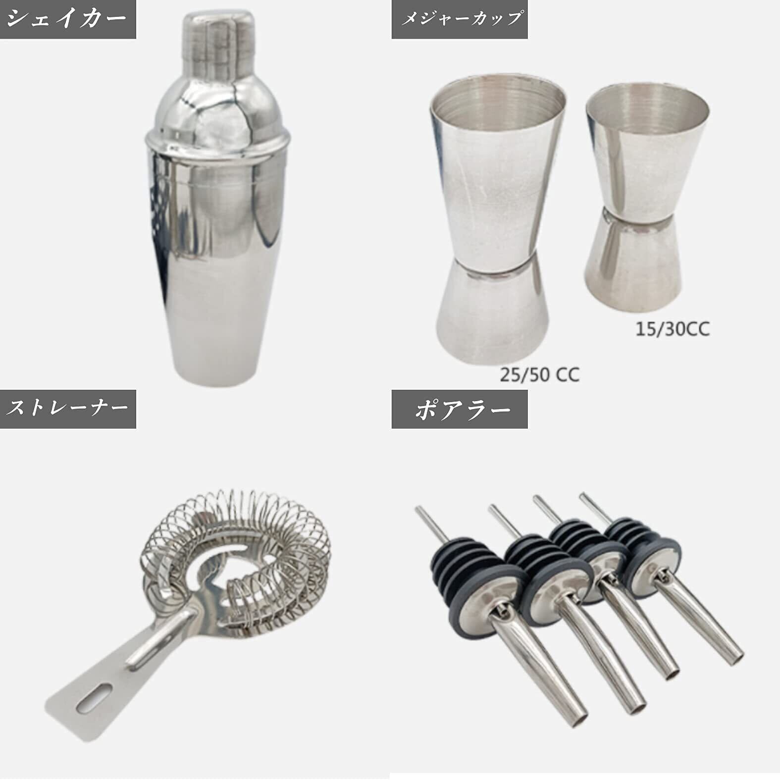 お酒以外にも、アイスコーヒー、紅茶、カクテル、ファンシードリンクを作るのに最適です。シェイカー本体 お酒を入れて様々なドリンクを混ぜ合わせます。 メジャーカップ 大と小を使用しお好みでお酒を測れます。 ストレーナー カクテルシェイカーに残った氷や、果実をグラスに入れたくない場合に使用します。 ポアラー お酒のボトルに使用します。メジャーカップやシェイカーにお酒を注ぎやすくしてくれます。 アイストング 氷を掴むのに使用します。 バースプーン グラスのお酒を混ぜる(ステア)するときに使用します。 モヒートペースト モヒートを作るときに使用します。必ずモヒートを袋やラップで包み込んだ上から使用してください。 ワインストッパー ワインボトルに使用してください。 ワインオープナー 栓抜きです。 スタンド シェイカーセットを綺麗に収納させてくれます。 ブラシ ストローを洗う専用のブラシです。