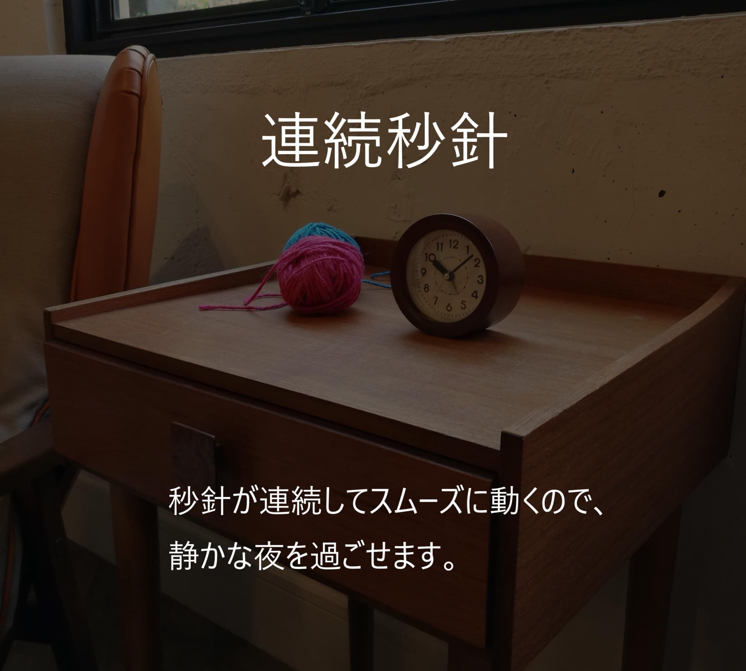秒針はコチコチと音がならない、夜間も静かな連続秒針を採用