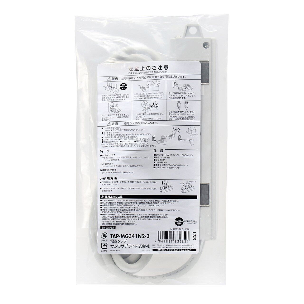 サンワサプライ 電源タップ 3P・4個口 3m 裏面マグネット・3P→2P変換アダプタ付き TAP-MG341N2-3