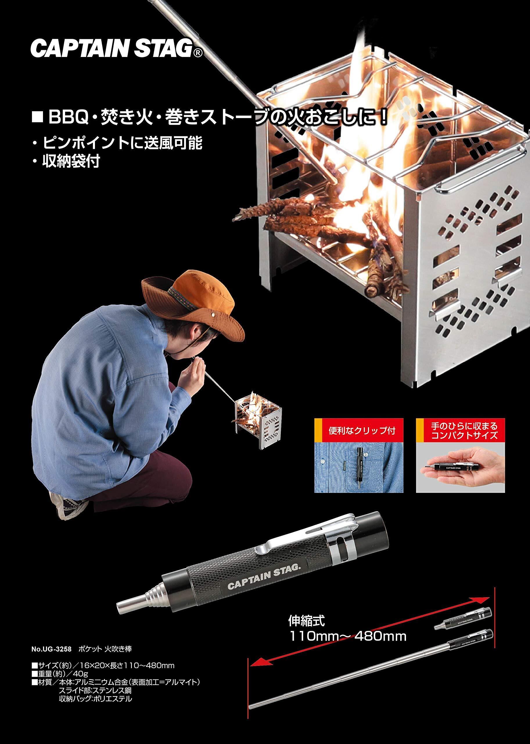 【在庫処分】スライド火吹き棒 伸縮式 クリップ付き 送風機 火起こし 収納袋付き 火吹き棒 ふいご UG-3258/UG-3283 STAG) キャプテンスタッグ(CAPTAIN | Synergia